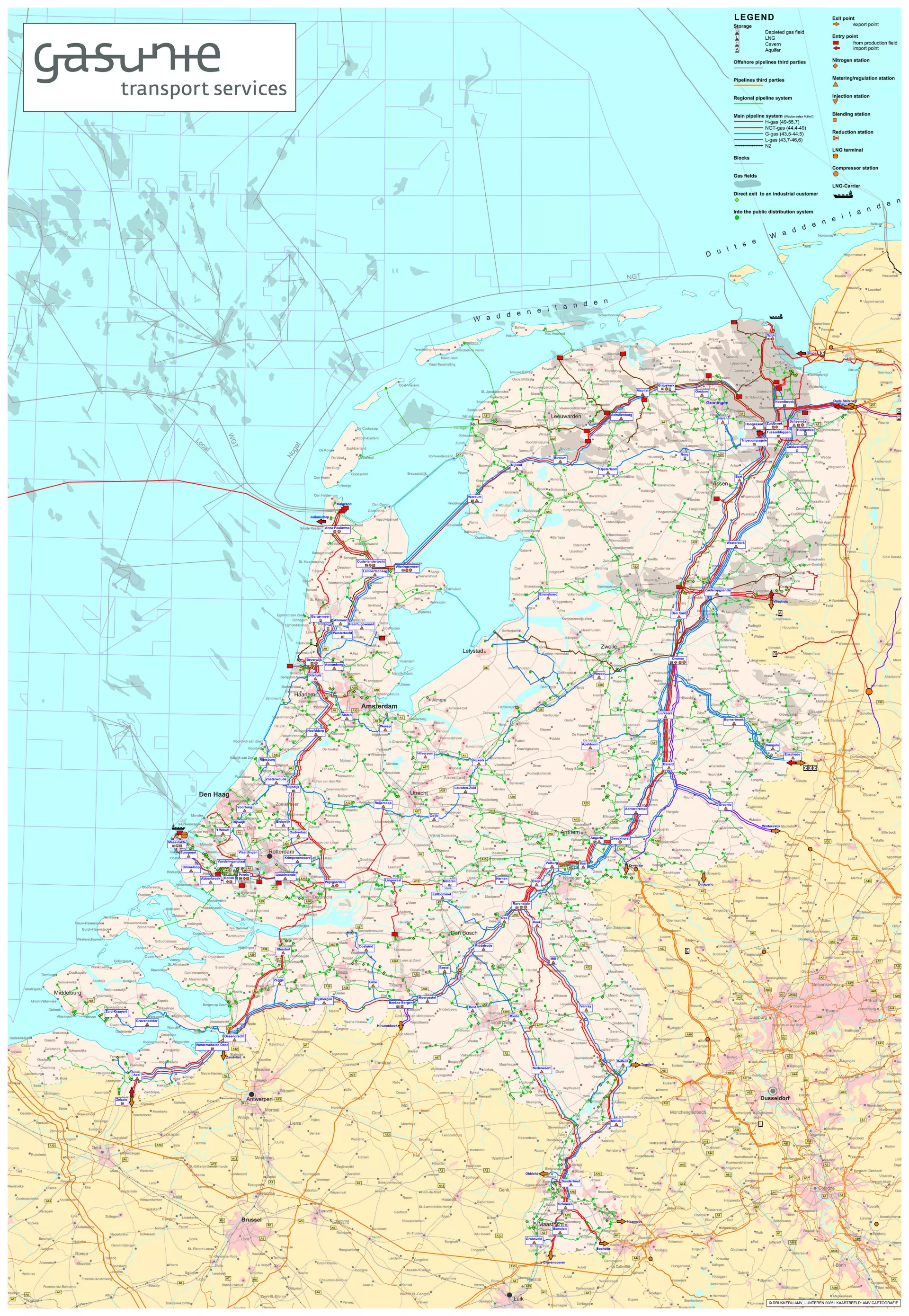 The transmission networks operated by GTS consist of pipelines and facilities. These networks are divided into a main transmission network (HTL) and a regional transmission network (RTL), based on pressure class. The HTL (high pressure, big pipelines) transports gas at national level; the RTL is the intricate distribution network (medium pressure, smaller pipelines) to which local gas distribution companies are connected. The HTL is divided into a high-calorific network (H-gas) and a low-calorific network (G-gas) based on gas type.