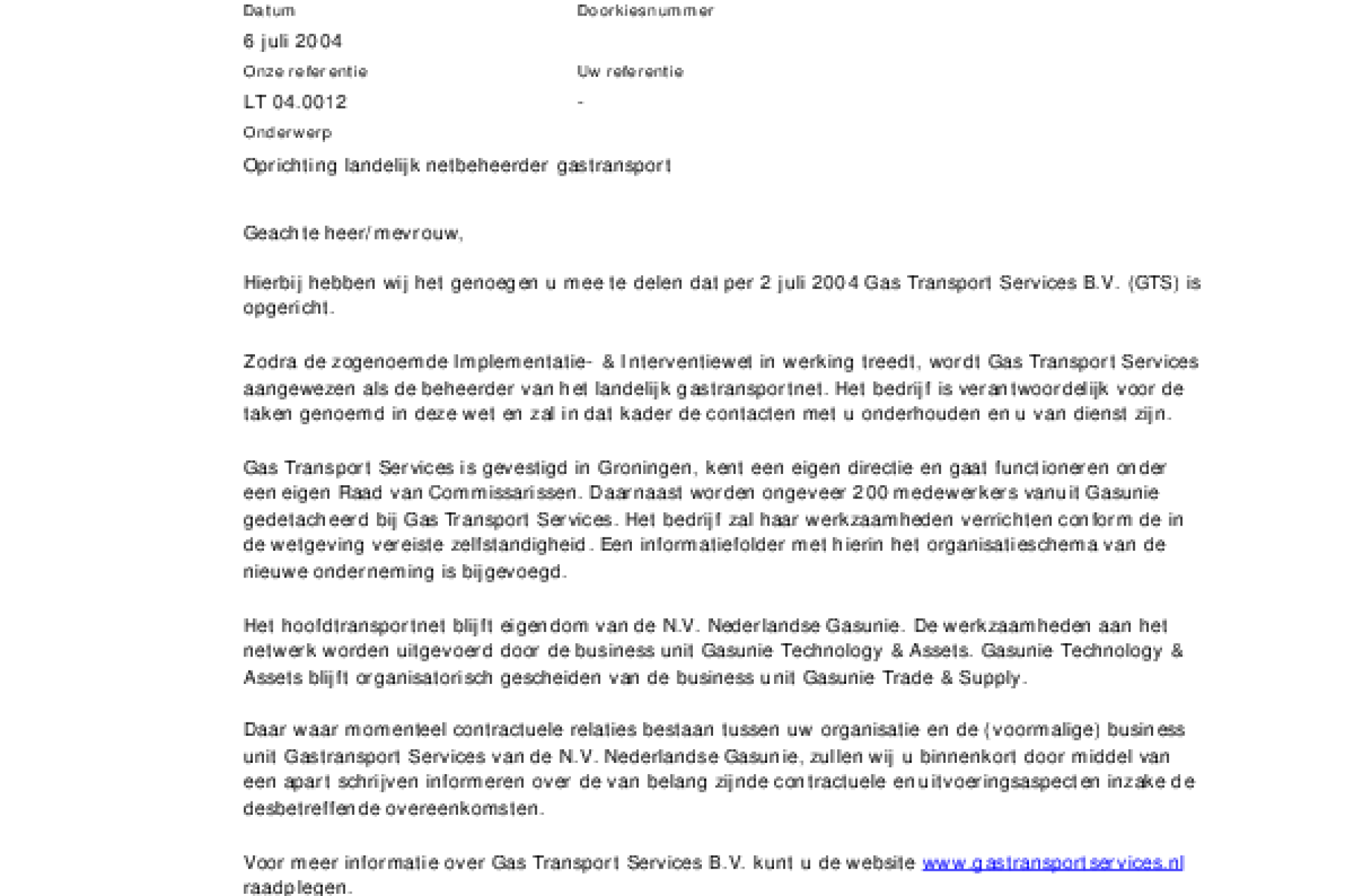 Bijgaande brief is heden aan onze relaties verzonden naar aanleiding van de oprichting van Gas Transport Services BV.