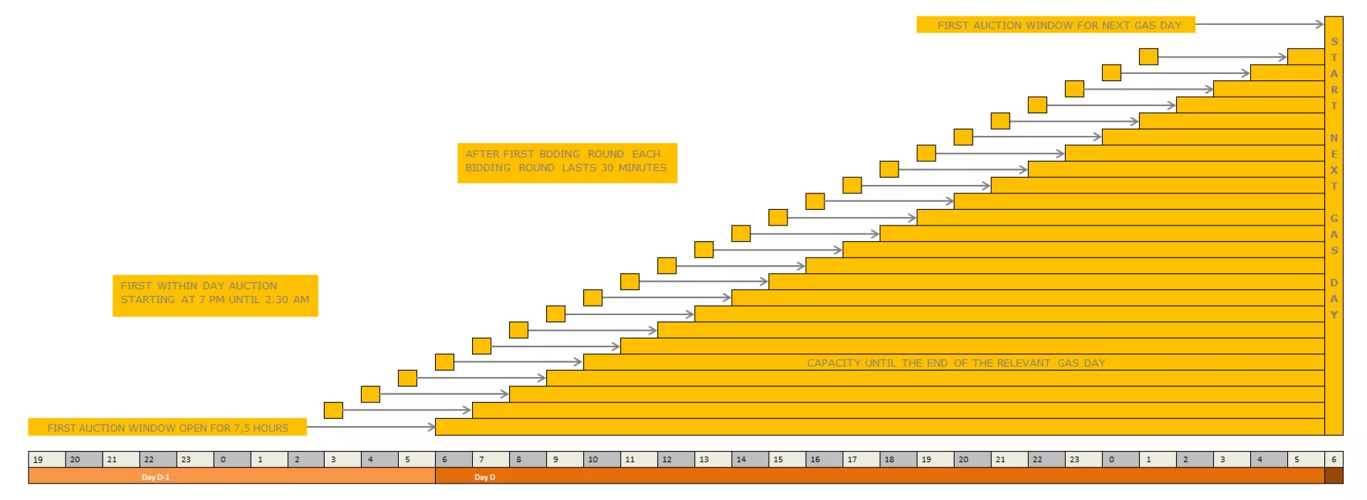 The first WD bidding round starts at the previous gas day at 7:00PM (LET). This auction will remain open for 7.5 hours until 2:30AM (LET). The following auctions start on the hour and remain open for 30 minutes. The capacity of a successful bid can be used from 3.5 hours after the close of the WD auction.